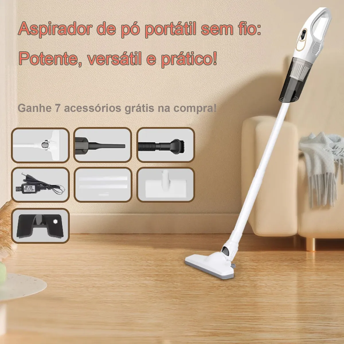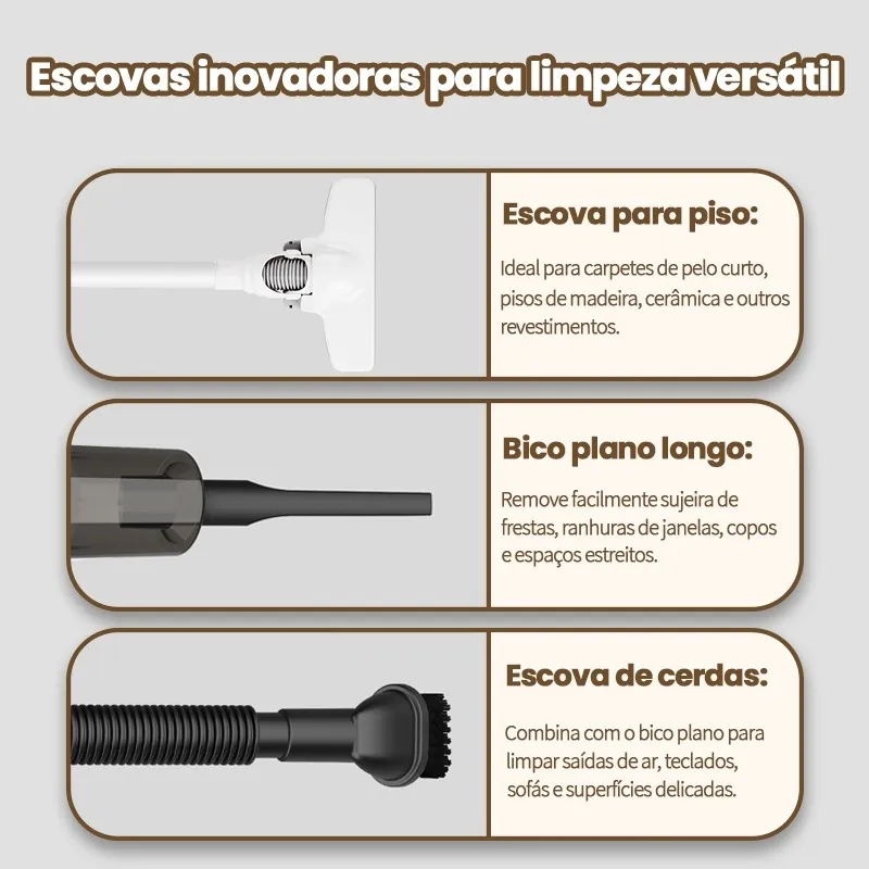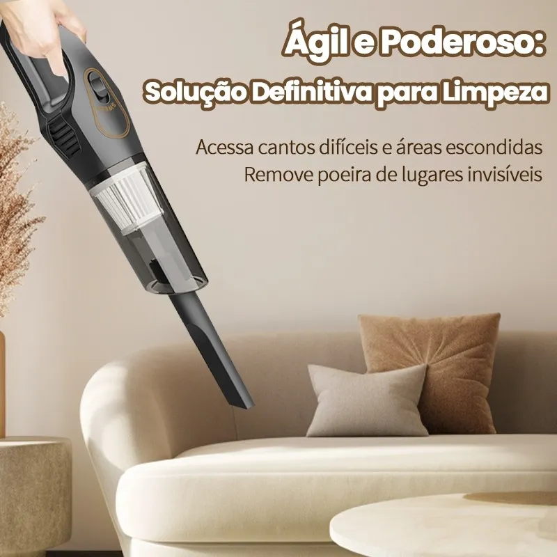 Aspirador Sem Fio: Tecnologia 3 em 1, 3 Cabeçotes Adicionais, Revolucione a Limpeza Residencial!Apresentamos o Aspirador Sem Fio — a solução inteligente de limpeza definitiva, equipado com potência de nível industrial e design ergonômico. Desenvolvido para quem valoriza o tempo e a qualidade de vida, este aspirador sem fio oferece performance leve e manuseável. 3 cabeçotes especiais gratuitos e tecnologia HEPA tornam a limpeza ainda mais fácil!
