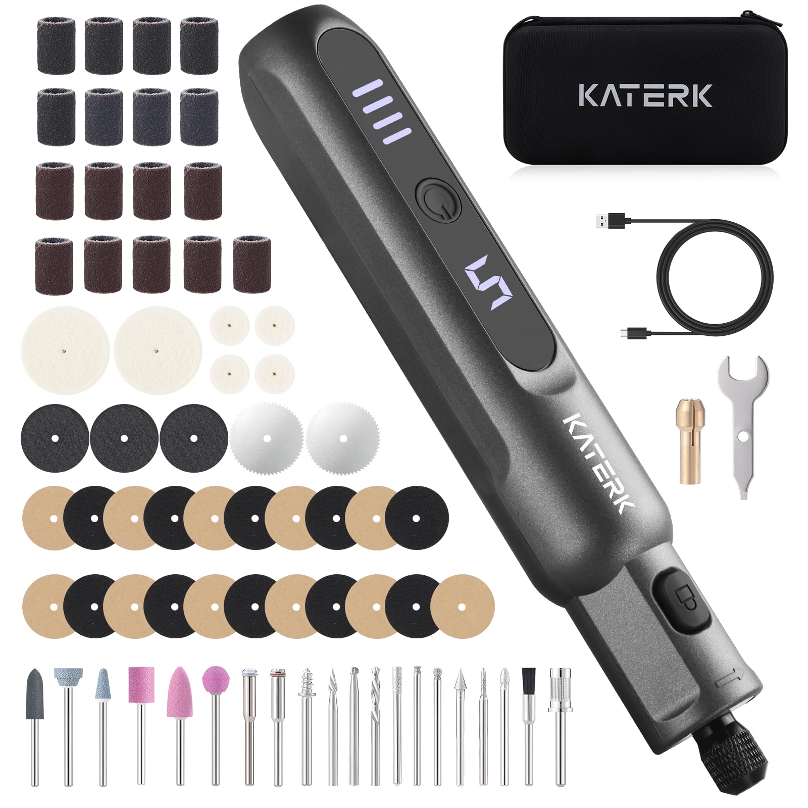 5-Speed Control & Memory Function: Katerk’s cordless rotary tool features variable speeds from 5,000 to 20,000 RPM for precision tasks. The smart memory preserves your setting when restarted within 5 minutes, then auto-resets to Speed 3 for next use—no repetitive adjustments needed. Work smarter with effortless control!Extended Runtime & Smart Power Display: This 3.7V power rotary tool packs a 2500mAh high-capacity battery (25% longer runtime than others) with an innovative 4-LED power bar that displays real-time battery levels. Stay informed and work uninterrupted (Type-C charging—recharge when 1 light remains).Compact and portable: This mini rotary tool is ultra-lightweight at just 0.33…